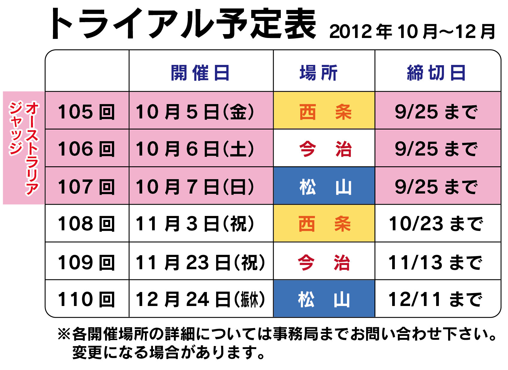 10月5日(西条)6日(今治)7日(松山)のトライアルは、ローリー・ナウス氏のジャッジで行われます。